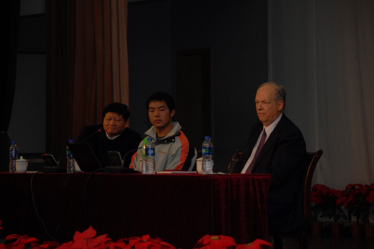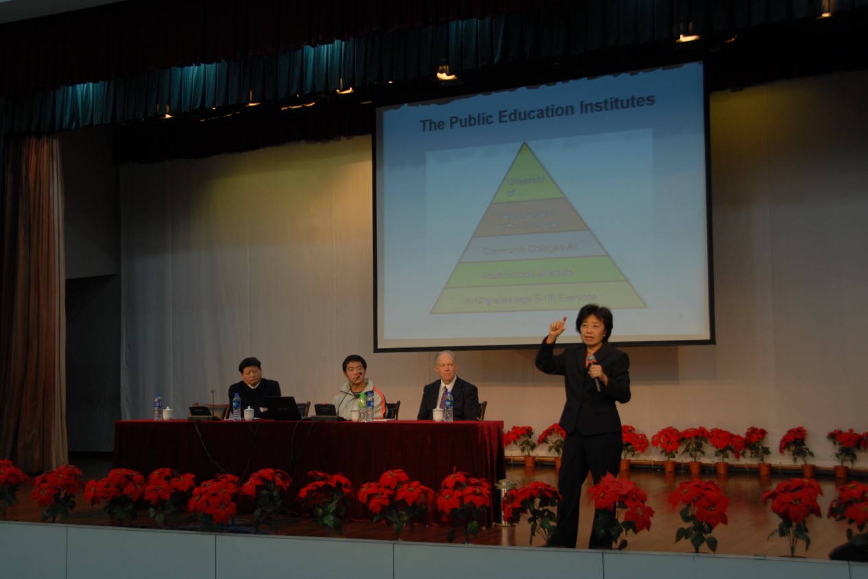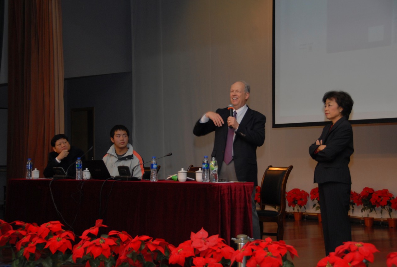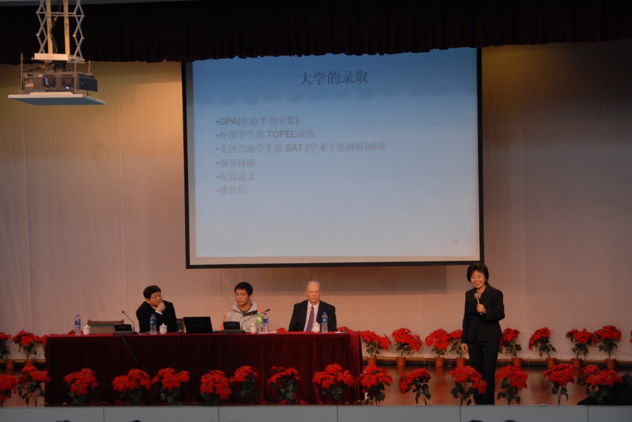 2012年11月30日下午16:00美国南加州大学教授张曼君(Marina Tse)女士和理查德•安德森(Richard Anderson)先生在南外报告厅为南外师生做了一场关于美国中学教育、高等教育体系及留学申请技巧》的精彩讲座。张曼君教授曾任职布什总统23位内阁之一的美国教育部副助理部长,相当于执行副部长、美国劳工部美西总长。理查德•安德森先生是美国好莱坞电影导演,世界著名电影特殊音效编导与设计专家,曾获奥斯卡金像奖。