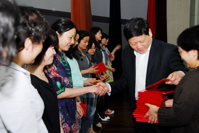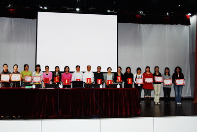 4月15日下午,在校大礼堂举行2009教坛新秀、优秀青年教师总结表彰大会。会议由孙夕礼副校长主持,教学处东群主任、陈波主任、马雪生主任分别总结点评了外语片、理科片、文科片的年轻老师在本次评比活动中的表现。丁莉萍(英语)、许亮亮(化学)、陈燕(语文)、周媛媛(历史)代表青年教师在会上发言。董正璟校长为优秀青年和教坛新秀颁发获奖证书。