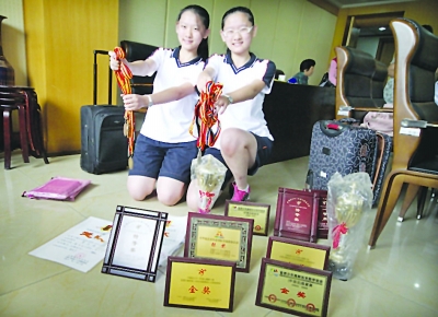 在南外的这帮竞赛达人里,有一对双胞胎姐妹费思媛、费思琦尤为引人注目,她俩不仅成绩优异,而且才艺过人:钢琴十级、围棋五段,跆拳道、街舞玩得都很溜!在暑假举行的江苏省中学生棋类比赛中,两人代表学校获得围棋团体第一名。这对双胞胎的相处方式让人喷饭:每次吵架爹妈都拿出扫帚、簸箕让她们决胜负,而为了下棋时不吵架,妈妈发给一人一个口罩让“闭嘴”!不过别以为她俩关系不好,其实关系铁着呢!