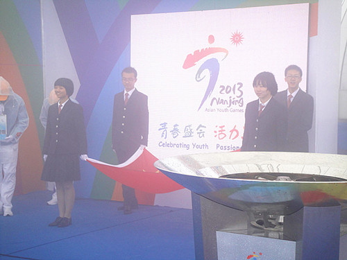 2013年5月8日是南京亚青会倒计时100天,南京亚青会火种采集暨网络火炬传递启动仪式在紫金山天文台城堡举行,我校高一凌宇峰和梁潇同学主持了全场活动,高一郭书宇、黄亦承、韦倩仪、高博、方琪、杨继伟、戴易之、龚苏玥担任执旗手,高一16名同学作为青少年代表也全程参与了此次活动。