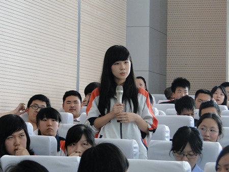 在评委离场商议结果的同时,场内的两校同学也都各自发表了观点,向辩手提问,场内不断碰擦出最美丽的智慧的火花,大家对辩题的理解又“更上一层楼。”有趣的是,我方四辩陈霄科同学受到了来自南京师范大学扬子附属中学的同学们的青睐,受到他们的高度评价,有些同学甚至表现得极其崇拜。