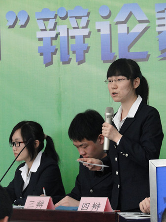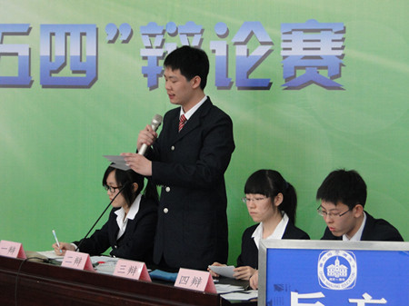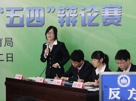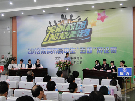 南京市“五四”辩论赛的主题是:“美丽校园,智慧青春。”南京外国语学校的高二同学们与南京师范大学扬子附属中学的同学们集聚在美丽的中华中学,倾听辩手们用青春的智慧谱写的史诗般的辩论赛。
