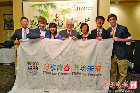 扬子晚报讯(记者 张可)4月28日,南京-圣路易斯友好城市35周年庆典在圣路易斯市的Mandarin House restaurant举行。这是中国和美国缔结的第一对友好城市。南京外国语学校的三名同学,在庆典上宣传青奥会,并与当年签署“友城”的圣路易斯市的老市长互动交流。