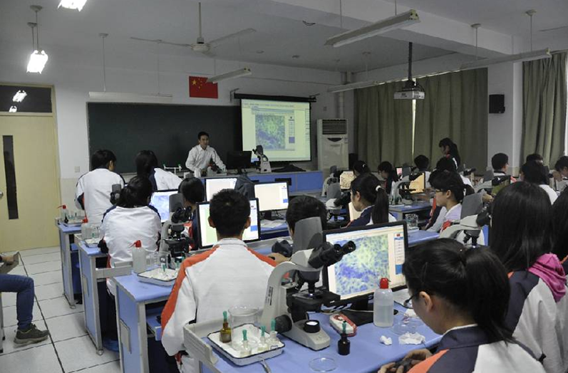 分校老师高度评价了我校生物实验室"高、大、上"的数码显微系统,做到了初高中每位学生一台数码显微镜,高中学生外加一台联网电脑,使得每位学生的实验观察结果能让全班同学共同分享,同时通过显微摄像将实验观察图像的作业上传给老师。先进的实验设备更激励我们老师更新课堂设计,用灵活多样的教学方法激发学生学习生物学的兴趣。