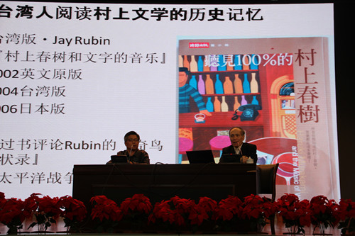 首先,藤井教授对日本著名大众文学家村上春树做了简要介绍,他在肯定村上春树杰出的文学成就的同时,也指出其作品中一些值得探讨的地方。接着,他以《挪威的森林》为例介绍了村上的作品在亚洲各地区和国家分别在其不同的历史时期的翻译方式和内容解读方式。他特别提出了中国对村上春树作品翻译的归化作用,以适应中国读者的阅读需求。