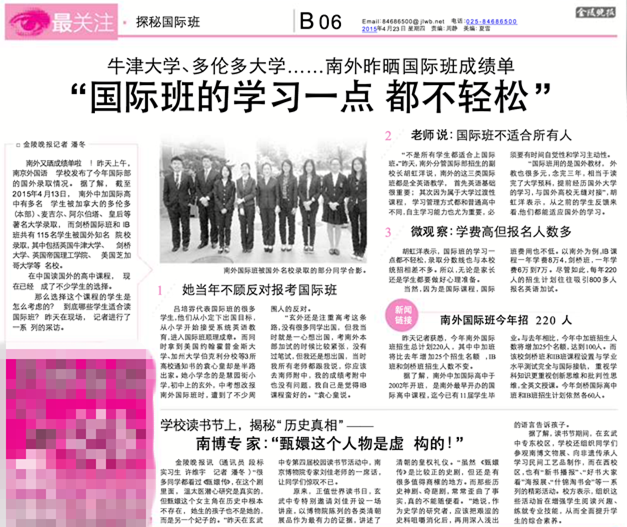国际班到底有什么特别?南京外国语学校副校长胡虹洋说,国际班的课程设置与学业水平测试符合国际标准,全英文与国际化的教学环境,还有在个性化课外活动中全面提升个人素质。而国外高中看似自由度高,实际是要求学生要自主规划自己的学业,而且平时的成绩也很重要,容不得松懈。