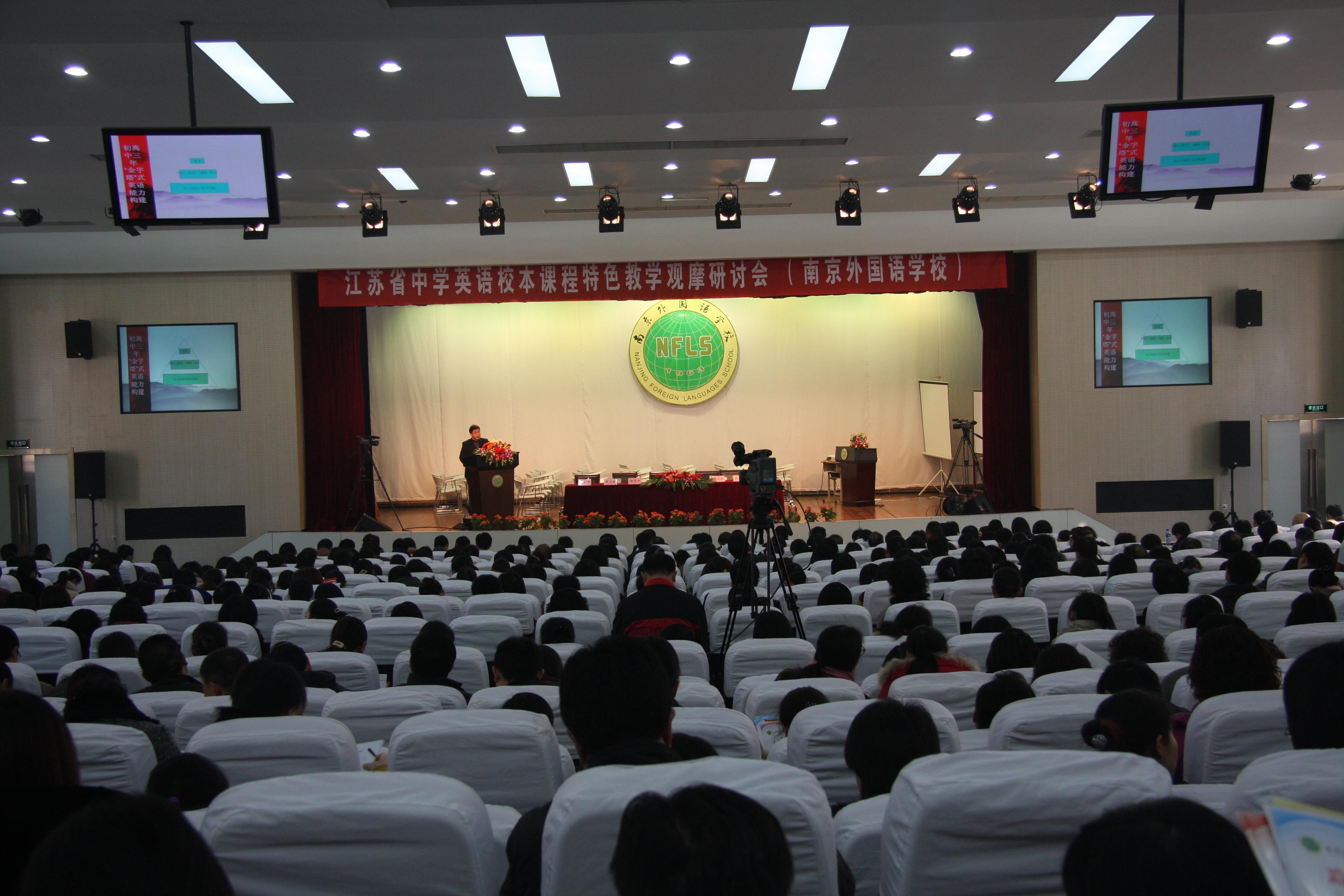 本次校本课程特色教学观摩研讨活动由省教研室何锋书记主持,江苏省教育厅基础处陆志平处长致贺辞,南京市教育局周文海副局长致开幕辞,南外董正璟校长致欢迎辞。贺东亮副校长向与会代表简要地介绍了南外英语校本课程的设置及教学特色的相关情况。多位教师为与会代表共同展示了具有南外特色的五节观摩课,她们分别是:黄蓓的《牛津高中英语》(词汇教学)、李爱云的《牛津初中英语》(词汇教学)、王笑伊的《戏剧》、孔小囡《英语报刊阅读》、徐斌、贺晓燕、徐红漫、杨春贵、周文、孔小囡等的《模拟联合国》。每位教师的观摩课在展现南外英语教师的基本素质(南外的教育理念、纯真流利的英语口语、扎实的教学基本功及独特的南外英语教学方法)的同时,也展示了每位教师各自的个性和教学风格: