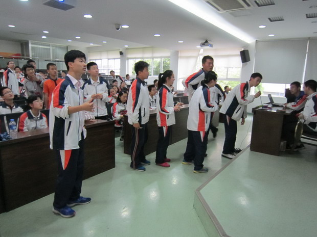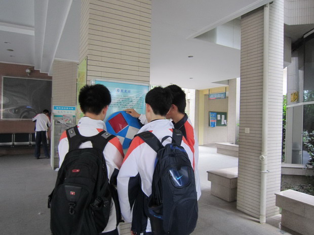 A楼大厅热闹异常,地上一块板子,2位初中学生的及其人,摆弄着各种姿势进行着格斗,是故意的作秀,场外围拢着一层层观看的人群。真好玩啊!这是怎么做出来的?是如何实现控制的?我想参加怎么办?精彩的机器人表演,不仅吸引了学生的观看,还激发了学生的兴趣,吸引了学生的参与和研究热情。