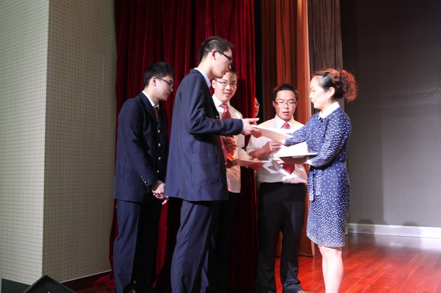 周 弋 副校长代表学校宣布了南京外国语学校2012至2013学年“周恩来奖学金”获奖者名单。 章灿洵、姚博文、周 围、贾志鹏同学代表获奖同学上台领取证书,让我们向他们表示热烈的祝贺!