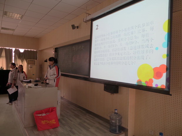 今年面向初一初二的体育知识竞赛如期进行。此项活动体育部主要负责赛前宣传、报名、通知,比赛题目及正确答案的制作,比赛主持以及比赛时场内秩序的维持。本次比赛在周二周三周四的中午举行,周二周三中午分别决出两个年级的前六名后,周四进行决赛决出最终的优胜者,颁发相应的奖品及奖状,每个年级的前三名班级的参赛者均可获得体育星。比赛的题目主要由体育部助理负责,包含了体育基本常识,体育百科还有与体育相关的数学题目等。比赛阶段比较顺利,也公平地决出了名次。比赛现场气氛较为活跃,更有亲友团加油助威。而本次体育知识竞赛的顺利举行也充分体现出了南外人对于体育的热爱,再次迎合了本届体育节的主题“青春南外,活力无限”,发扬了南外人特有的体育精神。