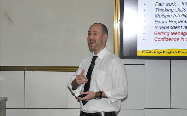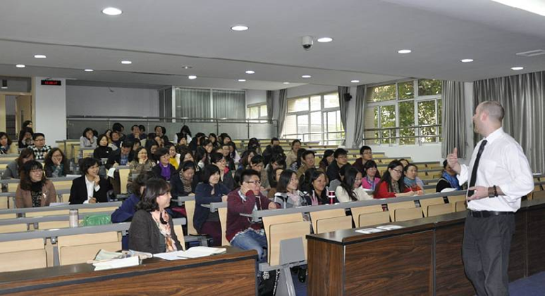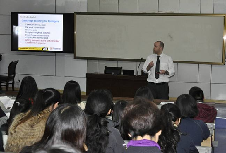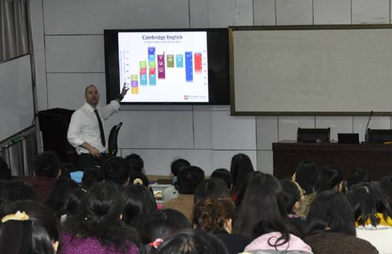 2014年11月7日下午,来自英国剑桥大学教材中心的Gevin J. Biggs在我校二楼阶梯教室给所有英语教师进行了英语教学培训。Biggs先生从英语学习者最常拼错的十个词入手,分析了学生的学习心理,提出如何用交际教学法培养学生学习英语的兴趣培和营造良好的课堂气氛。接着,他向老师介绍了教材中心新编写的英语教材以及多功能学习平台。讲座引发了老师们的浓厚兴趣,结合我校学生的情况问了许多有针对性的问题。老师们都觉得收获良多。