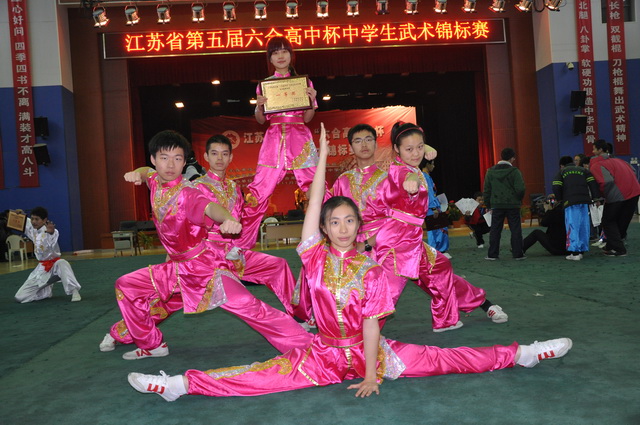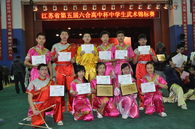 在上周刚刚结束的2012年“六合高中杯”江苏省第五届中学生武术锦标赛中,我校武术队参加了长、南拳,长、短器械,传统器械等五个单人项目,集体拳术、棍术等两个集体项目,经过队员在场上的努力拼搏,最终取得了三个单项第一名,两个单项第四名,集体项目全部取得了一等奖,这是我校武术队自参加省中学生武术比赛以来,取得的重大突破。另外我校还获得了体育道德风尚奖,取得了比赛成绩与精神文明的双丰收。具体如下: