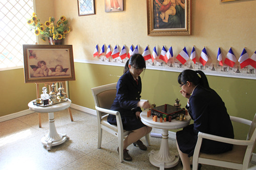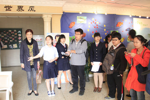 结对情况介绍之后,文化教育代表带领记者们参观了学校的“世界风”展厅。为了配合青奥同心结以及文化小屋的宣传活动,“世界风”展厅里布置了黎巴嫩、法国和图瓦卢三个国家的文化展。通过简单的氛围营造和装饰布置,同学们可以感受到我们对这三个国家文化特点的理解和小屋设计理念。