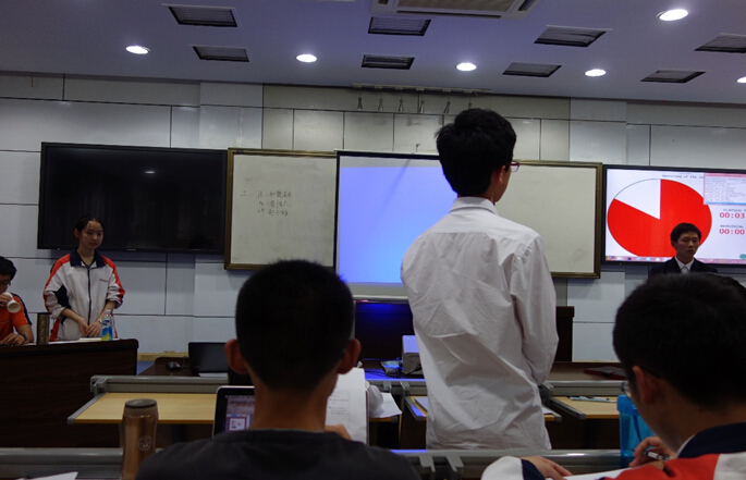 第二轮比赛(决赛)于5月28日在E2楼阶梯教室进行。考虑到同学们参赛积极性很高,同时为了使更多的同学获得出场机会,决赛在晋级的三支队伍的基础上,增设由被淘汰班级的优秀选手组成的“优秀个人队”。比赛从下午四时一直进行到晚上八时。决赛最终成绩为高一1班(2队)44.375分位列第一,“优秀个人队”41.000分,高一8班40.625分,高一4班36.500分。