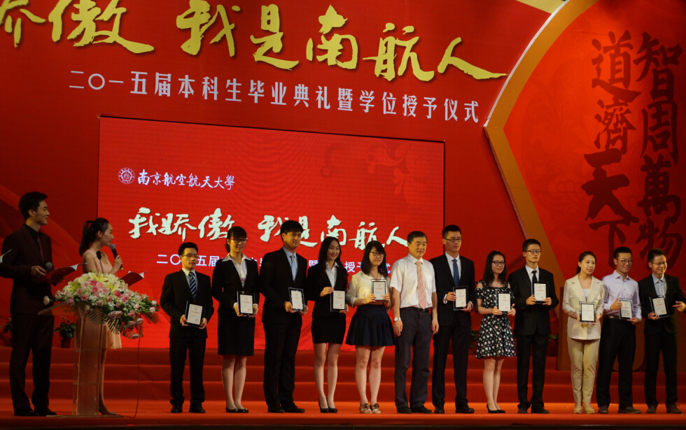 近日,南京航空航天大学2015届本科生毕业典礼暨学位授予仪式在明故宫校区大学生活动中心举行。典礼现场,由南京航空航天大学党委书记崔锐捷为11名优秀毕业生颁发“大学成就奖”,来自南京外国语学校的2011届毕业生袁琬欣和黄鸣阳喜获该项荣誉。该奖项是南航学子在本科阶段的校内最高荣誉,奖励毕业生中涌现出的优秀典型,该年度11名获奖者是从四千余名毕业生中层层选拔而出,南外保送至南航的学子中有两人同时获得此荣誉实属第一次。