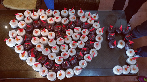 今年上午10点,我校组织退离休教师参与重阳节活动,在现场为老教师们准备的重阳糕被摆放成了爱心型的图案。