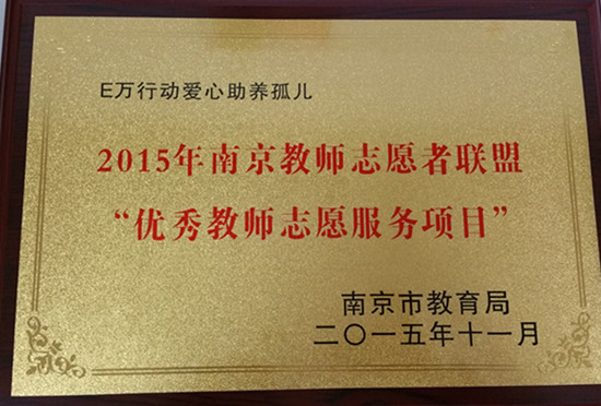 经市教育局评选,南京外国语学校“E万行动爱心助养孤儿”项目被评为2015年南京教师志愿者联盟优秀教师志愿服务项目。