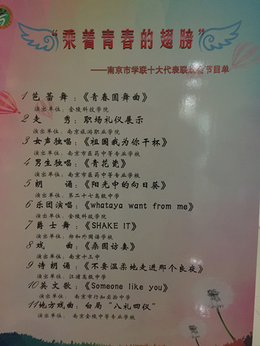 2015年12月9日至10日,初一5班肖国豪、初二10班章书维同学作为列席代表,高二4班帅帅作为正式代表,尹荷蓉老师作为特邀代表出席了在南京金陵科技学院召开的南京市学生联合会第十次代表大会。