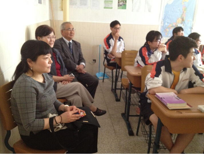 4月14日下午中国传媒大学南广学院日本专家河合正男先生在市外办亚洲处处长孙曼的陪同下来我校参观访问。参观了高二年级韦珏老师的日语课,并给学生作了简短讲话,之后参观了校园。河合先生是日本资深外交官,曾担任过挪威、驻文莱等国大使职务,是对华友好人士。