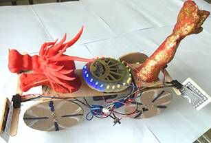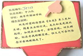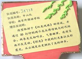 《南京外国语学校中山队》队长高一5班的沈童童说:出发时我们信心百倍,因为我们深知:机会总是留给有准备的人的,我们抓住每一分可利用的时间,在培训中罗老师教我们学会了看图、绘图、修改图,还亲眼见识了激光雕刻机操作的全过程。我们学会了基本工具的使用,学会了木工划线、割据;学会了金工组装、紧固各种另配件;还意外地学会了电工焊接、接线,数字电路中的触发器工作原理和操作方法,见识了LED循环灯的制作;收获太大了。我们《双龙戏珠》造型主体的龙头是3D打印的,龙尾是美术才女刘思远制作的,想必一定能吸引评委的眼球,激光雕刻机的启动,也为我们的训练找到了一条通往胜利的捷径,节省了大量的割锯木料和钻孔时间。训练开始就可以在老师的指导下直接组装、调试,得以尽快地从中得到感受、启发和悟性。在训练时我们每个队员团结合作、分工负责,加上平时训练有素,方法得当,尤其是负责万兽之王的陈玥如、明嘉浩同学,在练习的时候他们谁都说服不了对方,总是先吵,再做,再比,再改。于是在上一次省级比赛的基础上,万兽之王又有了较多改进。这次赴台参加“2015 Power Tech华人区科技之星创作竞赛”,我们取得了很不错的成绩,但比起在训练和比赛期间收获的种种,成绩和名次真的是微不足道。