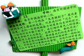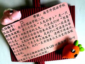 《南京外国语学校中山队》队员初二8班的陈玥如说:万兽是我负责的,在练习时我对此已经非常熟练了,可进场后主持人突然宣布时间减半,不禁使我微微有些慌乱。我还算有调理地改变了摇臂上几个动作,加长连杆。触控器缠到了造型上,我干脆利落地剪断卸下,换上拔河的框架和电路。时间只剩下一分钟,周围的人都还在忙碌。我又将配重用的砝码固定在万兽的两只前脚上,确定重量不超过规定的700克。还剩十几秒,我突然想到拔河时可能会没电,急忙更换了电池。最后确定所有螺丝上紧,在哨声中放下了螺丝刀。第一场我们对阵的是一只身躯较长,但结构并不复杂的万兽,比赛是三局两胜制,前两局我就轻而易举的取胜。进入前16强,在一片掌声中,我转身向队友致意,又紧了紧螺丝,很快就迎来了第二场。第二场对阵的,是一个台湾女生拿着的结构和我做的很不一样的万兽之王,前脚很大,后脚很小,我们大陆几个队做的后脚都很大。台湾研究这项比赛有十六年了,而我在训练的三个月里也在不停的改变结构。对手的结构是很好的,但我发现她后脚的防滑是用双面胶粘的——肯定不牢。但第一局她赢了,在第二局激烈的拔河中,对手万兽脚上的防滑垫掉了,没了防滑就失去了威力,我想机会来了,第二局我很幸运的赢了,紧接着我们迎来了第三局,决胜局的拼搏。短暂交换场地后,她急忙装牢防滑垫,我友好地提醒她不要着急,慢慢来。决胜局中,她的万兽之王,在15秒内彻底地被我拉散了结构,我们队胜利晋级前八强,只听到身后一片热烈的掌声,我们又赢了。哇!我们进入了前8强,我再一次给万兽洗洗脚,用袖子擦了擦防滑垫,进入了8强抗争(拔河)。对手实力太强,结构高、后脚小——力量集中在一点上。下一次我们学校参赛时,可以再在结构上进行创新,超越这次季军的成绩。