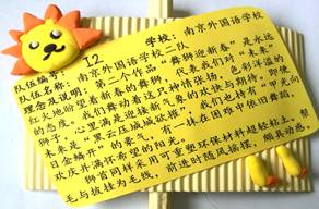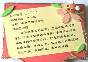 我们南京外国语学校,是从2015年9月才开始涉足这项活动的。所以,这次谁也没料到我们南外会冲进前八强。《南京外国语学校中山队》的领队兼总教练罗雪华老师和队员沈童童、刘思远、陈玥如、明嘉浩在短短的3个月中付出了很多很多,同样也收获了很多。我们《南京外国语学校中山队》是一个团结、友好、战斗的集体。大家既有共同的兴趣爱好,又有不同的兴趣延伸,同学们平时互相关心、相互学习、互相帮助、取长补短共同提高,在创作中享受快乐。