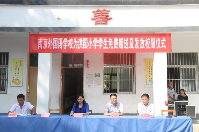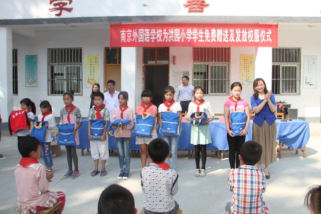 今年6月,洪园小学的校长主动联系南京外国语学校,希望南外能够再次向这所已有百年历史的乡村小学伸出援助之手,为孩子们添置一套校服,使他们能像城里的孩子们一样穿着校服上学。在收到洪园小学的请求之后,南外积极回应,并迅速与校服厂家联系,终于在本学期开学初,把为孩子们量身定做的校服送到了他们的手中。