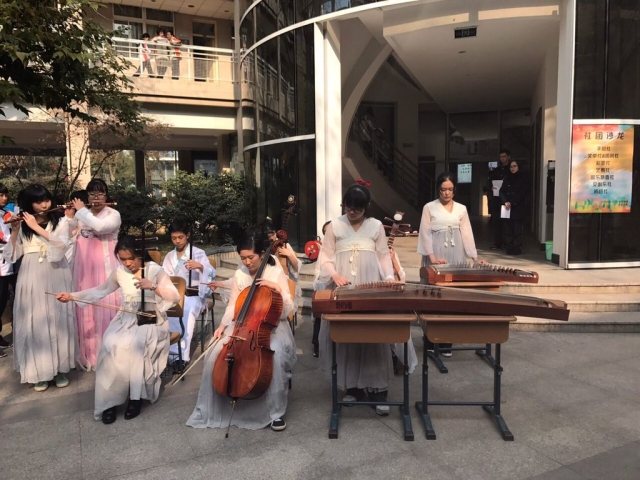 此次社团沙龙活动,极好地契合了艺术节“风、雅、颂”的主题;同时它作为继社团招新之后第一次多个社团的巡礼展示活动,也完美地展现出各社团风采。首先上场的手绘社,在两位心灵手巧的社长的带领下,现场绘制了古风面具,为沙龙增添了一份手工艺的艺术气息;交响乐社紧随其后,他们用全新的编曲和缠绵至深的音乐,演绎出一版独特卡农故事;接下来的彩墨社,用书法和彩墨元素结合的书签,记录下南外的故事;而此后的国风社和文学社,则联手把《烽火戏诸侯》这则故事改编并表演到极致,以紧凑的情节和到位的演技赢得阵阵掌声;艺舞社不甘落后,两首充满活力的歌曲搭配上女生优美曼妙的舞姿,配合得天衣无缝;紧跟着上场的折纸社用一张完整的纸,不剪不拼,竟折出“风雅颂”的字样;最后压轴的国乐飘香社则秉承着南外大社一贯的风度风采,改编一曲《菊花台》,使其与民族乐器完美融合,乐而不淫,哀而不伤。
