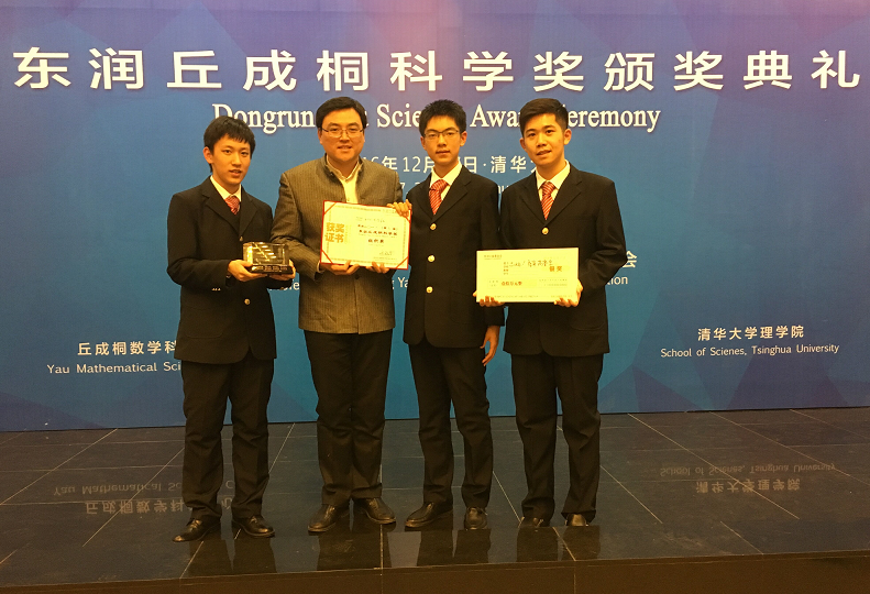 被誉为"中国青年诺奖"的东润丘成桐科学奖12月17日在清华大学揭晓。我校学生高二(1)班吕汉白(队长)、高二(4)班平鑫宇和高二(1)班高睿泉在化学教研组许亮亮老师的指导下,以《基于新材料的电子皮肤的设计与优化》的研究报告和出色的现场答辩,获得了2016年(第一届)丘成桐科学奖(化学)全国总决赛第二名(银奖),并获得了十万元奖金。