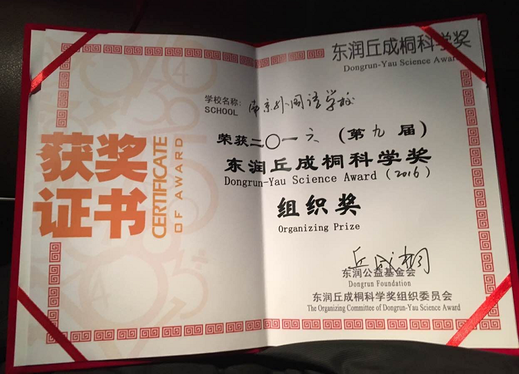 物理教研组潘志民老师指导的团队——高三(1)班张双翼、高二(5)班宋邦卓、高二(4)班潘开欣进入了2016年丘成桐科学奖(物理)的全国总决赛,他们的《声学微结构异常反射的理论与实验研究》的研究报告也获得总决赛鼓励奖。