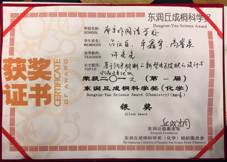许亮亮老师指导的另外一支团队——高二(1)班左云从(队长)、曹天天以《一种柔性自修复透明导体的制备与性能探究》研究报告获得本届丘成桐科学奖(化学)全国总决赛鼓励奖。