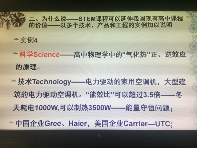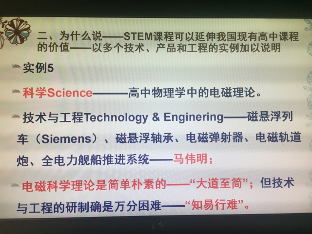 首先,李教授介绍了STEM课程所涵盖的范围,以及中美高中对其中课程的不同侧重。李教授的讲座侧重向大家介绍的延伸知识价值链主要是指的“技术”课程和“工程”课程。这恰恰是中国高中课程比较缺乏的内容。