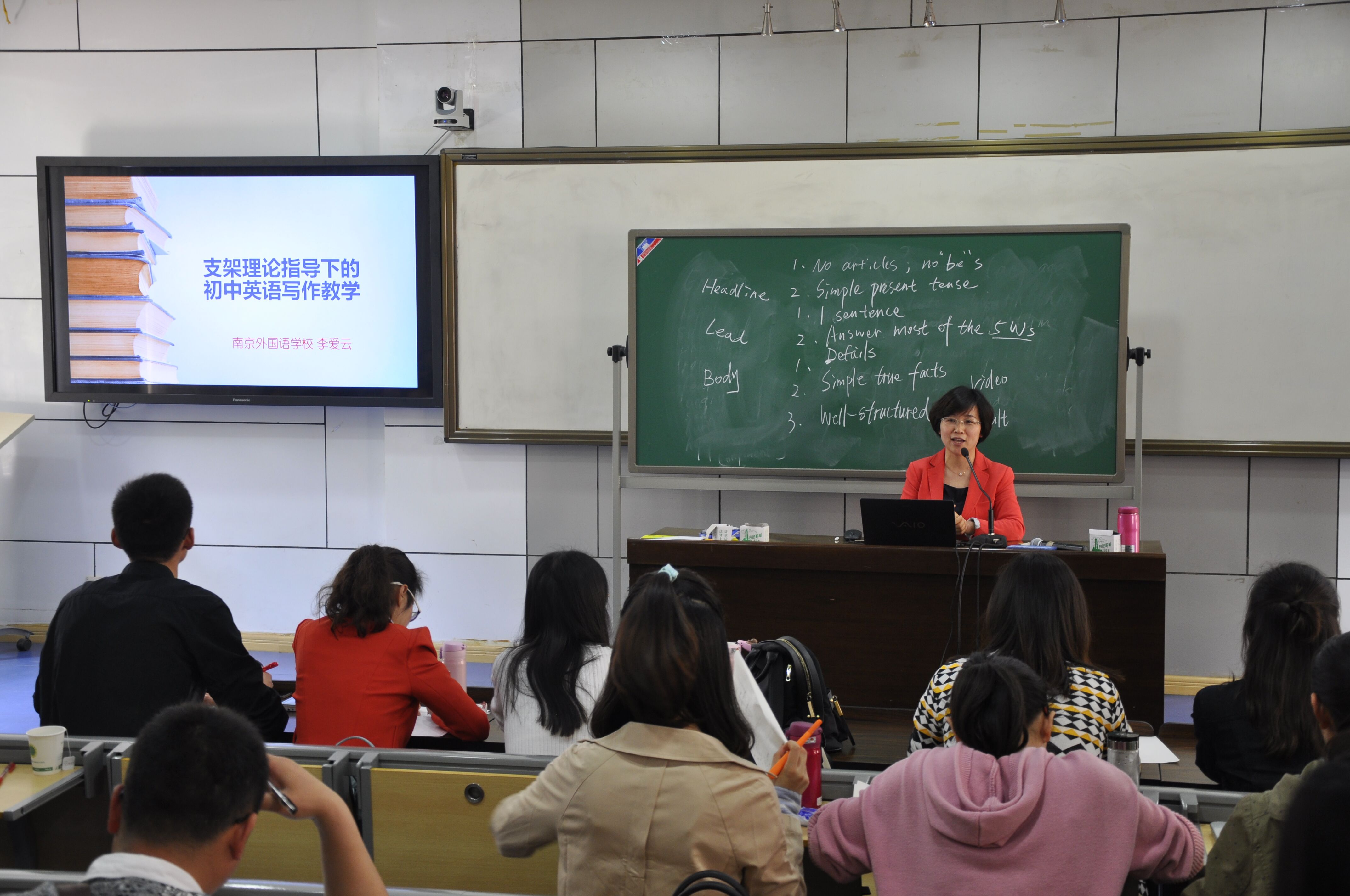 2017年4月24日上午,“南京市初中英语李爱云名师工作室”活动暨南京市初中英语教研活动在我校二楼阶梯教室举行。本次教研活动的主题是“支架理论指导下的初中英语写作教学”,旨在研讨和探究如何在初中英语写作教学中,在充分调动学生知识储备的前提下,教师帮助学生搭建写作需要的情境、内容、结构、语言、评价等“脚手架”,以完成不同文体的写作。