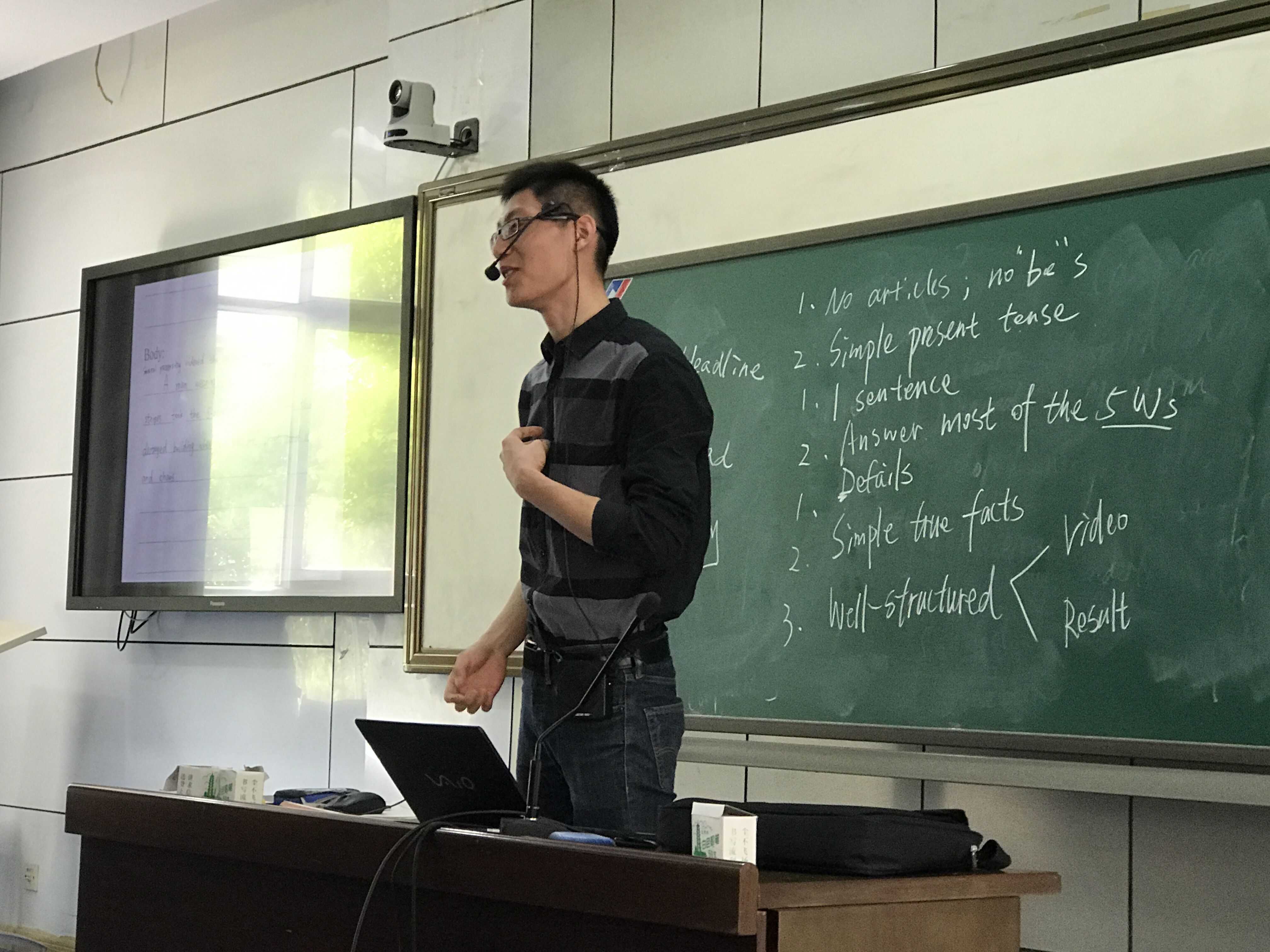 初二年级的侯思成老师展示了一节新闻写作课。侯老师的这节课从社会热点出发,通过简洁的课堂用语,清晰的教学步骤,对新闻标题、导语和正文的写作规则进行了细致的分析和操练。最终着眼于一则叙利亚战地新闻,引导初二的学生进行新闻写作。学生的新闻作品既体现了新闻的严谨和专业性,又反映了学习新闻写作的最终目的:传播信息,引起关注。这样的新闻写作课也提醒坐在课堂里的莘莘学子们,要成为真正的世界公民,得从关心社会、关爱他人开始。