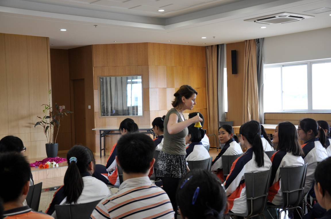 英语老师们热情参与到环莎专家Olivia Mace主持的工作坊中,用肢体语言去感受和了解莎翁戏剧中的角色。同学们也被Olivia独特的故事表演形式所吸引,几只鞋子、三两样简单的道具,在她的手中,在她充满魔性的声音中都仿佛被赋予了生命。