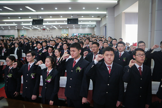 成人仪式上,由2011届优秀毕业生黄鸣阳同学带领学弟学妹们面对国旗庄严宣誓,激励他们积极承担国家和社会的责任。