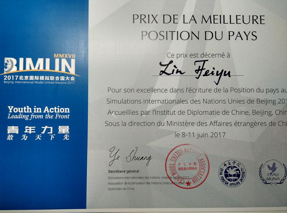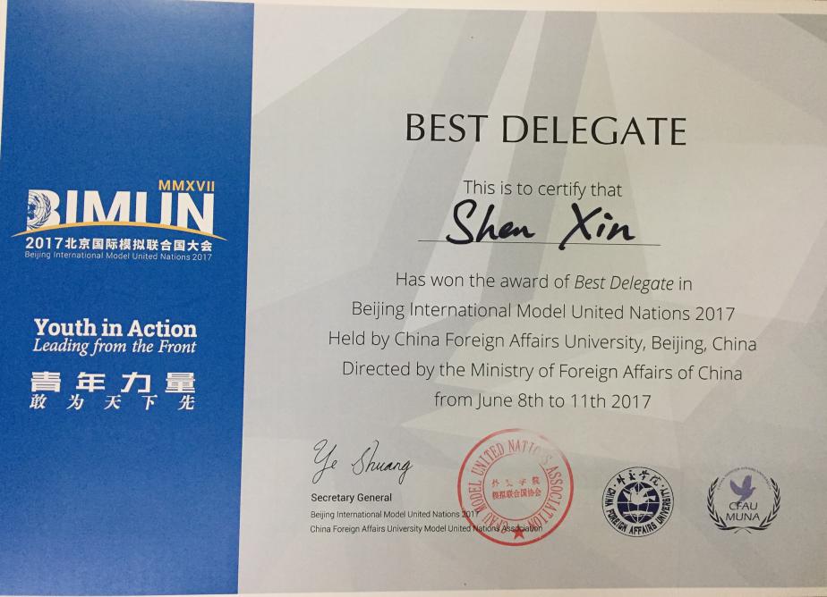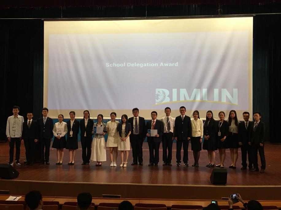 在我校胡雨辰老师的倾力指导下,我校获得了自参加该大会以来的最好成绩。高二(8)班刘晓晓同学荣获“联合国大会第一委员会——裁军和国际安全委员会”最佳代表奖(Best Delegate),高一(8)班沈昕同学荣获“联合国粮食和农业组织”最佳代表奖(Best Delegate,高二(7)班周子木同学、高二(3)班李孟若同学、高二(2)班李佳欣同学、高二(8)班卞格同学荣获“国际原子能机构”杰出代表奖(Outstanding Delegate),高二(6)班林霏雨同学荣获“联合国安全理事会”最佳立场奖(Best Position),高一(8)班吕尚泉同学荣获“联合国难民事务高级专员公署”最佳外交风采奖(Best Diplomacy)。