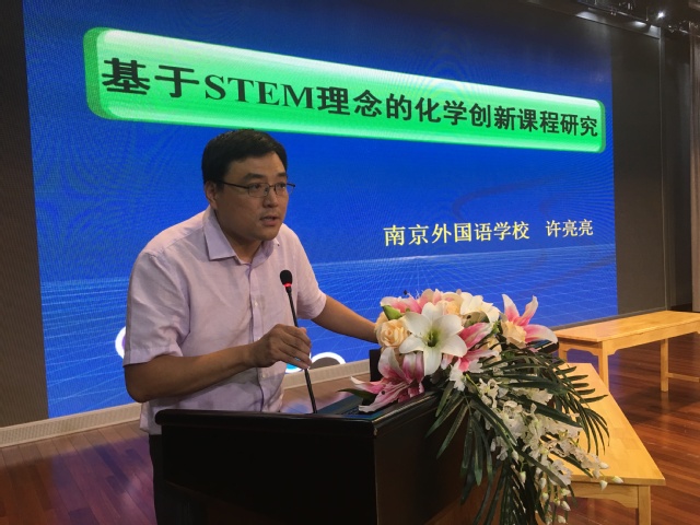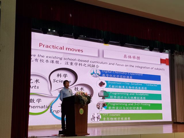 25日上午的经验交流中,我校朱征副校长应大会邀请,向所有参会代表分享了南京外国语学校STEM+教育的探索与实践。朱征副校长首先介绍了我校在培养目标引领下开展STEM+教育的动因,然后从教师团队建设、校本课程开发、学生社团提升、创新实验研发、国际课程引进、“走向大师”开展等方面详细介绍了我校具体实践做法以及近两年学生在STEM+教育中取得的丰硕成果。