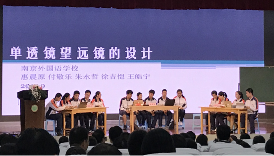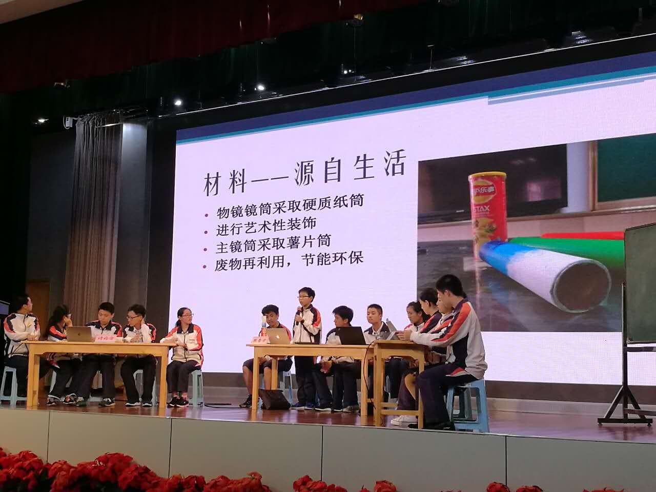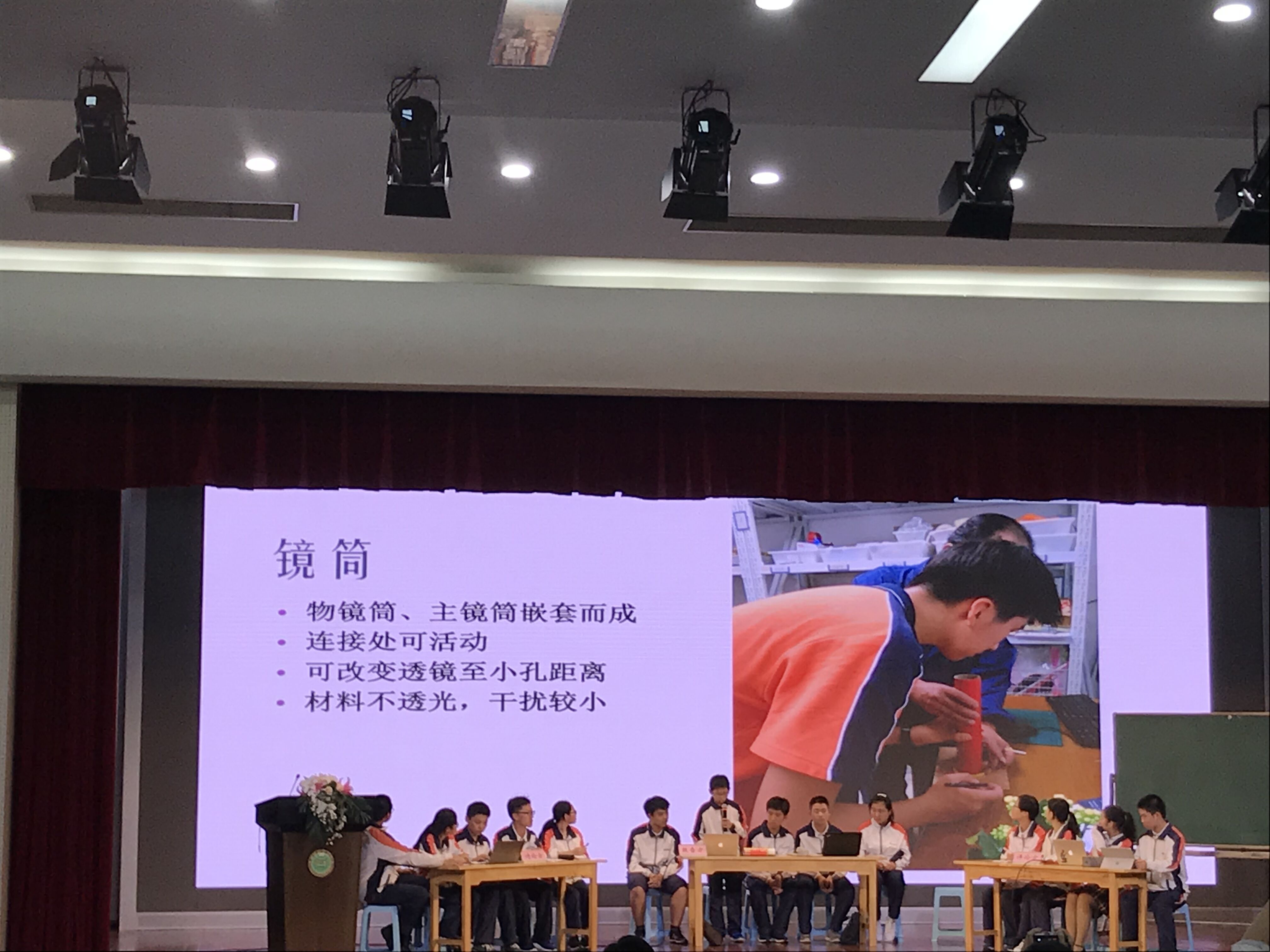 报告方由高二的朱永哲,高一的惠晨原、付敬乐、徐吉恺四名同学组成,他们使用了薯片桶和纸卷桶作为镜筒,分别嵌套并粘上透镜,充满新意且轻便可人。他们汇报了研究成果,包括实验设计方案以及理论分析,并与讨论方同学进行了互问互答,将辩论的形式融于实验汇报中。