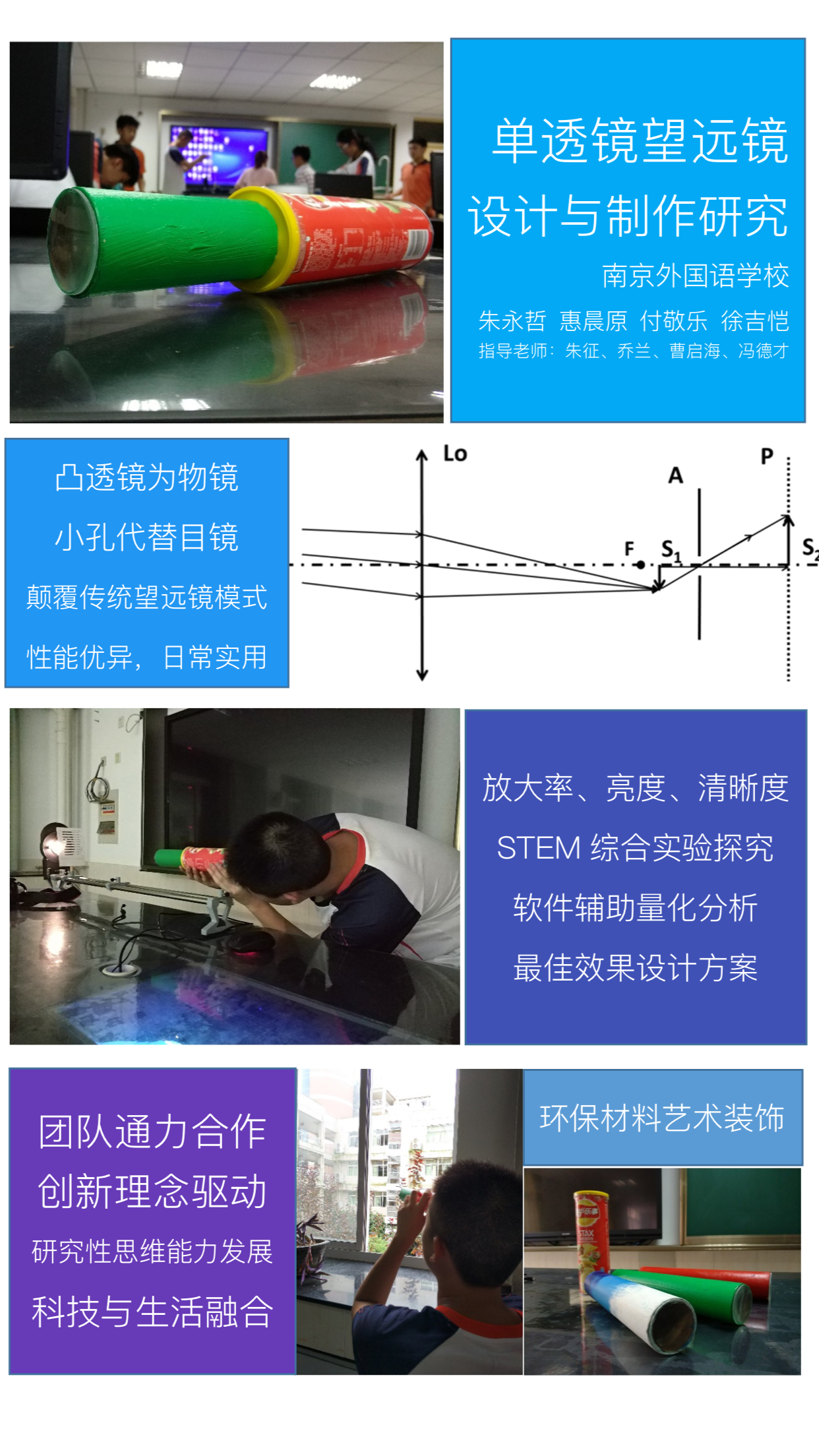 经过短短一两周的准备,每一组都使用自己的材料与工具,设计了自己认为最佳的解决方案,并通过各门学科老师的帮助,制作出三个风格迥异却殊途同归的单透镜望远镜成品。