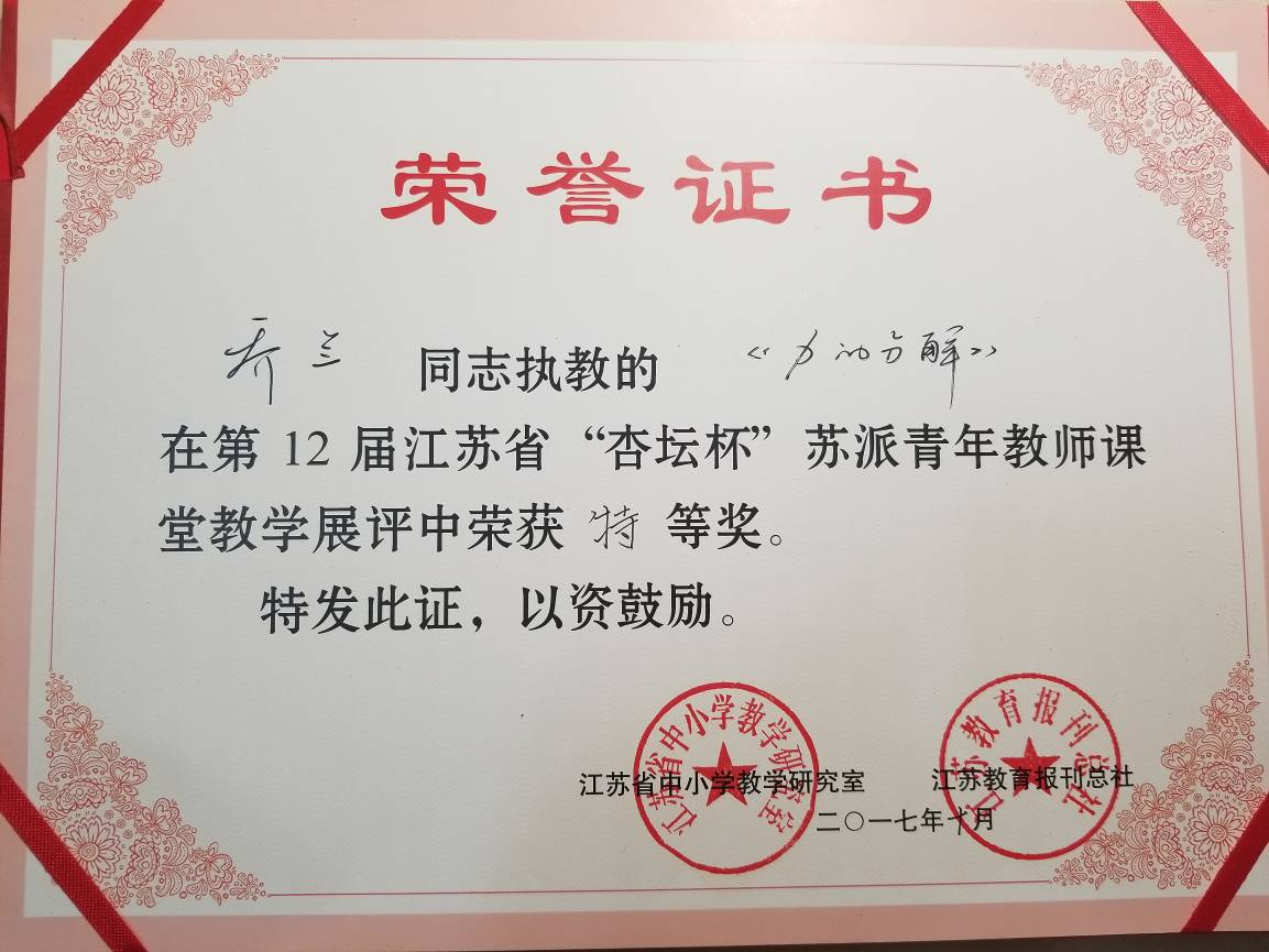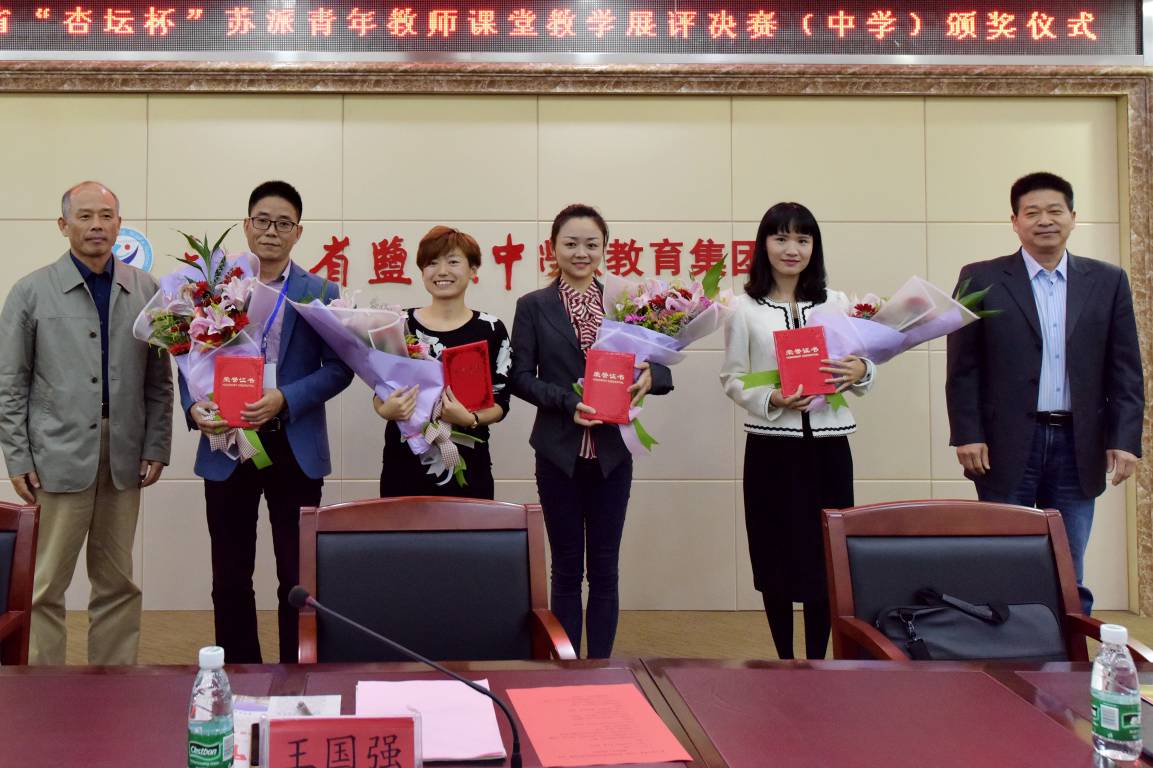 我校物理组乔兰老师于2017年10月12日至13日期间,在杜菁老师、邓佳卉老师、徐胜媛老师的陪同下,带着大量实验器材,驱车前往江苏省盐城中学,参加了由江苏省中小学教学研究室、江苏教育报刊总社联合举办的第十二届江苏省“杏坛杯”苏派青年教师课堂教学展评决赛。
