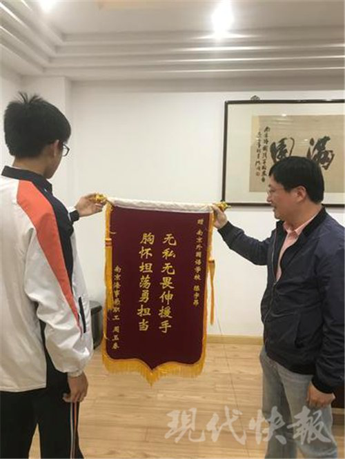 现代快报讯(记者蔡梦莹)遇到路人摔倒,你会上前扶吗?近日,南外小伙的这个举动感动了南京大妈。市民周女士提着一幅锦旗和一封感谢信来到南京外国语学校,特意要感谢的一名南外高一学生陈宇昂。