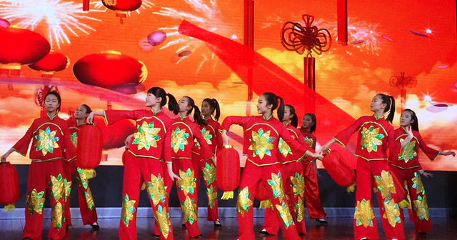 伴随着欢乐喜庆、激情洋溢的音乐,9班的歌舞《绸红处·落灯花》闪亮登场,只见舞台上红灯高照、彩绸翻飞,同学们舞动青春、绽放芳华,顿时点燃全场,大家仿佛进入央视春晚的现场。