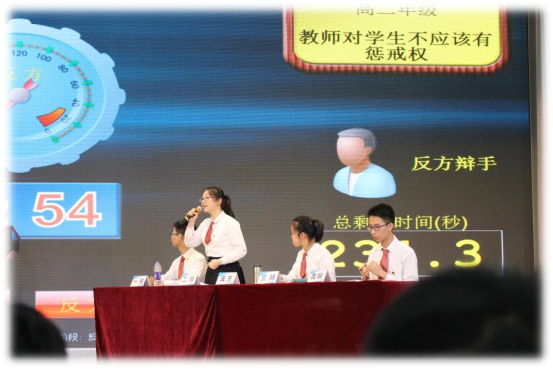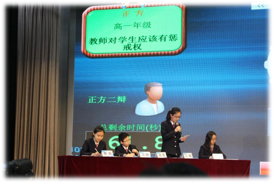 思辨让青春插上了翅膀,辩论赛决赛环节将本次活动推向了高潮。来自高一和高二的八位优秀辩手围绕“教师对学生应不应该有惩戒权”展开了激烈的辩论,思维的火花不断碰撞。辩手们思维敏捷,引经据典,陈词铿锵有力,充满激情,充分展现了青春的风采。