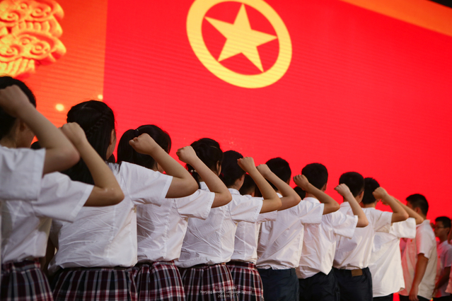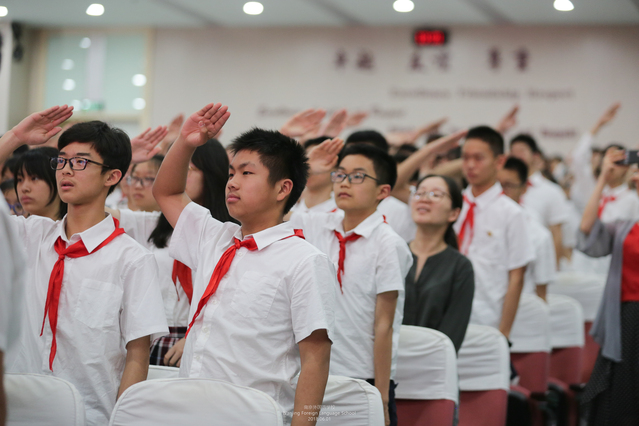 初二第一批入团的60名同学完成了入团仪式。他们面向团旗,举起右拳,庄严宣誓。