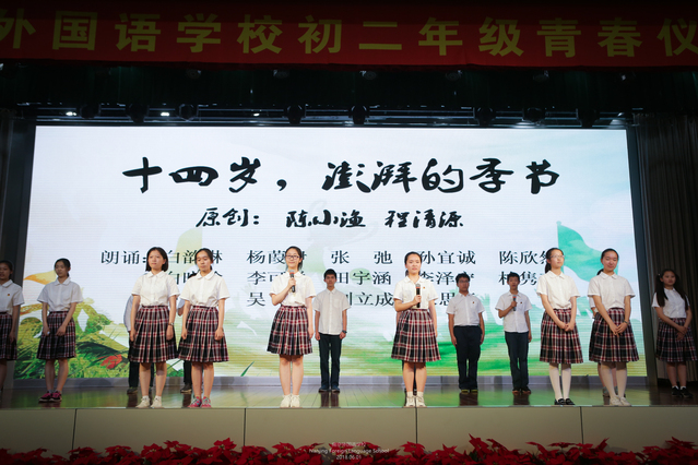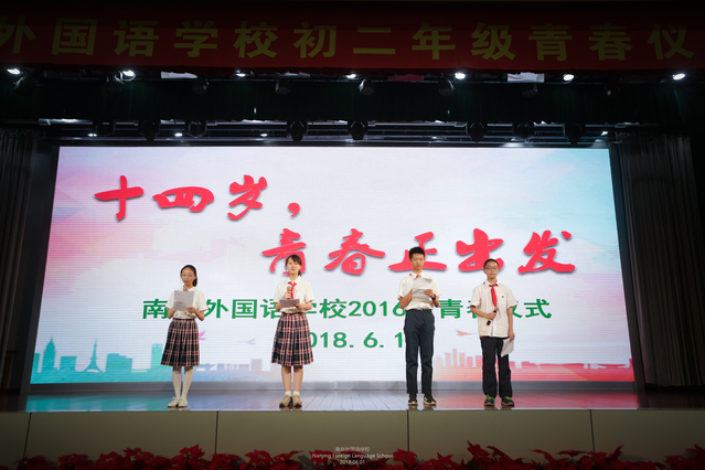 2018年6月1日下午,南京外国语学校初二年级全体师生齐聚本部报告厅,举行“十四岁,青春正出发”六一儿童节庆祝暨青春仪式的活动。