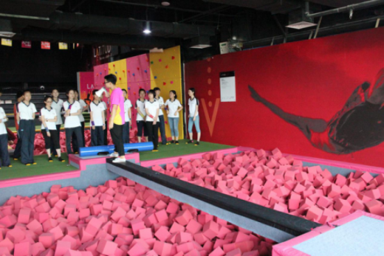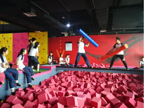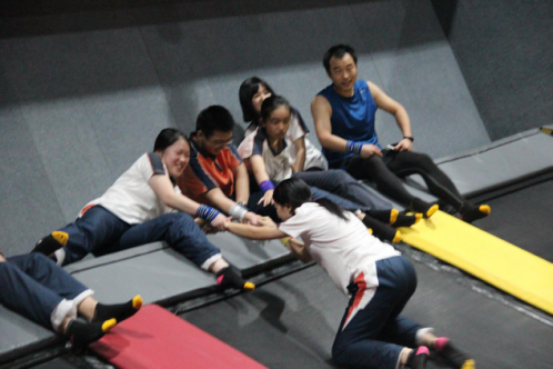 上午的活动中,同学们被分成四个小组进行两两对抗赛。蹦床竞速以接力形式展开,每一轮有三个回合,每个回合的比赛要求各不相同。其中最后一个回合难度最大,需要所有的同学们登上高台才能赢得胜利,这不光需要个人身高奔跑优势,还需要同学们之间的相互协作。
