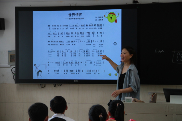 在音乐老师的带领下学习校歌《世界情怀》