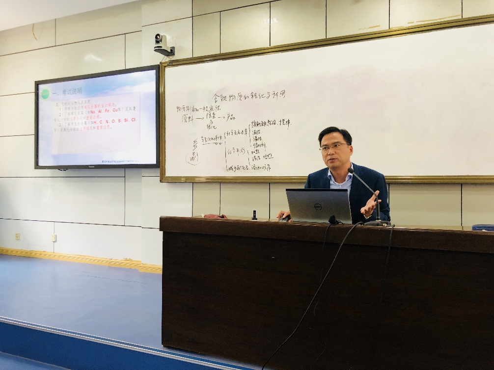 第三部分,刘前树书记以《元素化合物专题复习》为题开设了精彩的讲座,他从考试说明、命题特点、复习策略三方面作了详细阐述。尤其在复习策略方面,刘书记提出要注重训练学生书写陌生方程式的心态和技能,并结合自己的教学经验举例说明如何帮助学生理清反应的逻辑关系、引导学生对知识的多维度打开和多路径联系等。