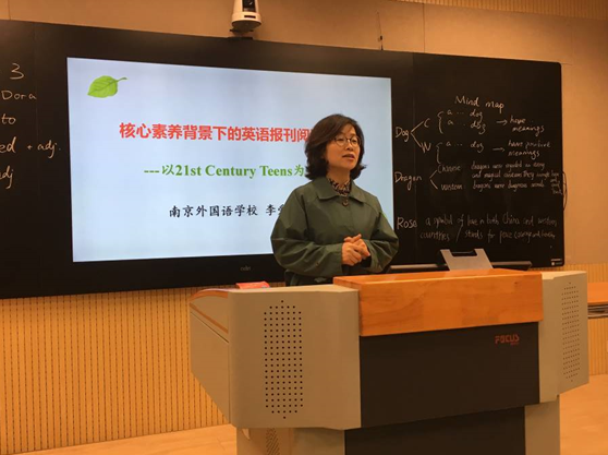 接着,李爱云老师以“核心素养背景下的英语报刊阅读教学”为题,为商丘一中的全体英语组教师进行了一场专题报告研讨会。李老师结合前一节公开课,与在场老师们探讨了一节好课的评价标准。她指出,课堂追问是课堂生成的重要时机,也是“赏识教育最高级的形式”。接着,她向老师们介绍了我校课外阅读的实践经验,点明了课外阅读之于英语学习的意义。她指出,通过报刊阅读,学生不仅积累了词汇、储备了知识、养成了开口的习惯,更培养了思维品质和文化意识。